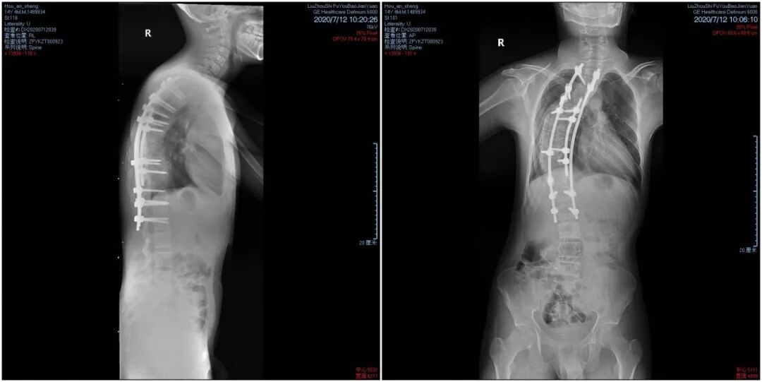 术后,小胜“剃刀背”畸形得到改善,脊椎平衡得到纠正。如今脊柱侧弯程度不到50度,身型从外观看基本恢复了正常,对生活基本不会造成太大影响。